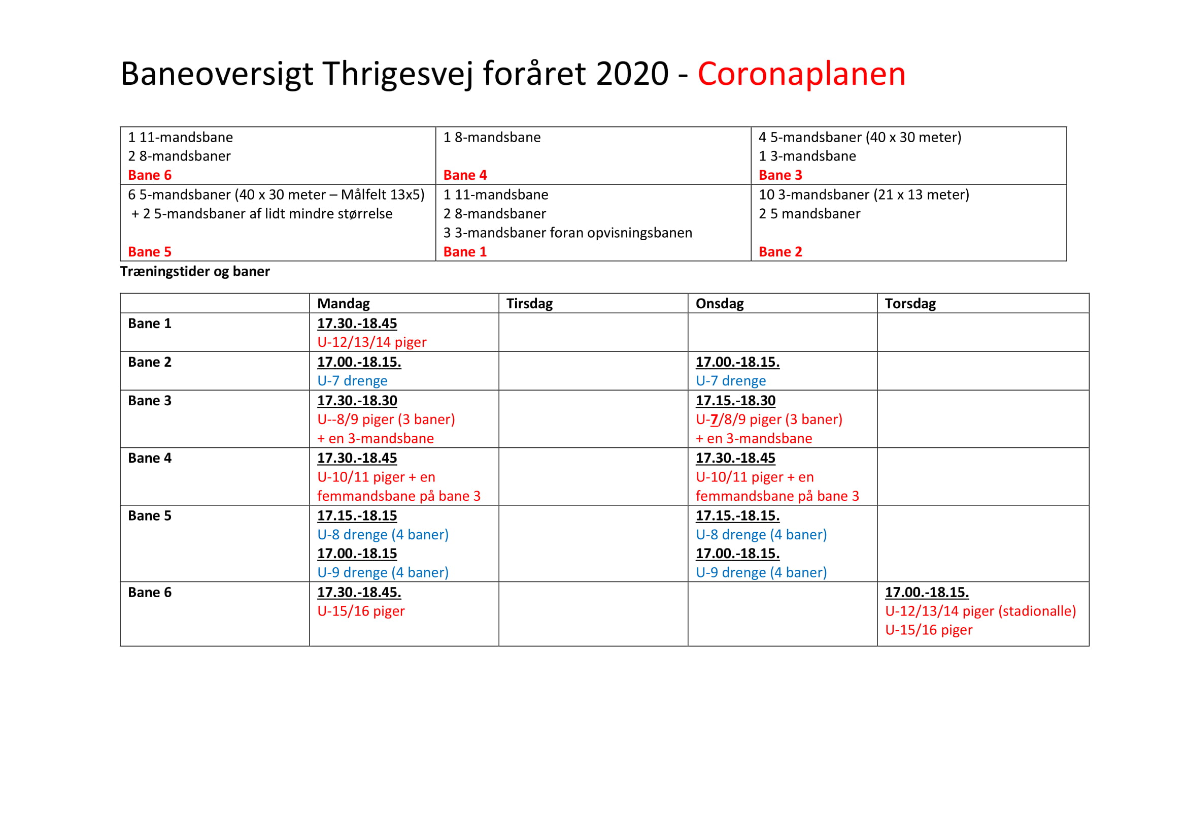 Så nedenstående kan I se både træningstider for de enkelte hold samt Corona retningslinjer. Sidst kan I finde oversigt over banerne med numre på.